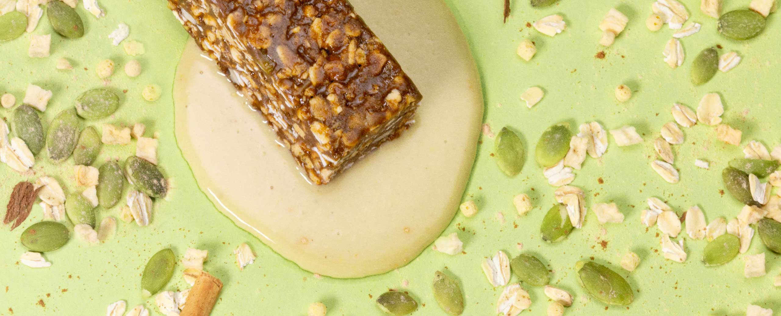 Savour HOLOS Apple + Cinnamon bars: a blend of grandma's apple pie and modern flavours with pumpkin seeds, apple pieces, sesame, and pumpkin butters, plus Ceylon cinnamon—comforting for any craving.